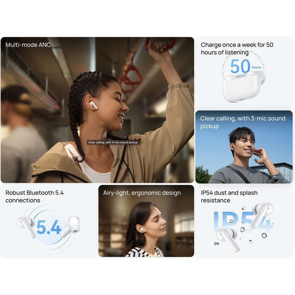 - Multi-mode Hybrid ANC: Adjusts intelligently between Ultra / General / Light modes, cutting noise up to 24 dB depending on your environmentโideal for travel, office, or focus time.