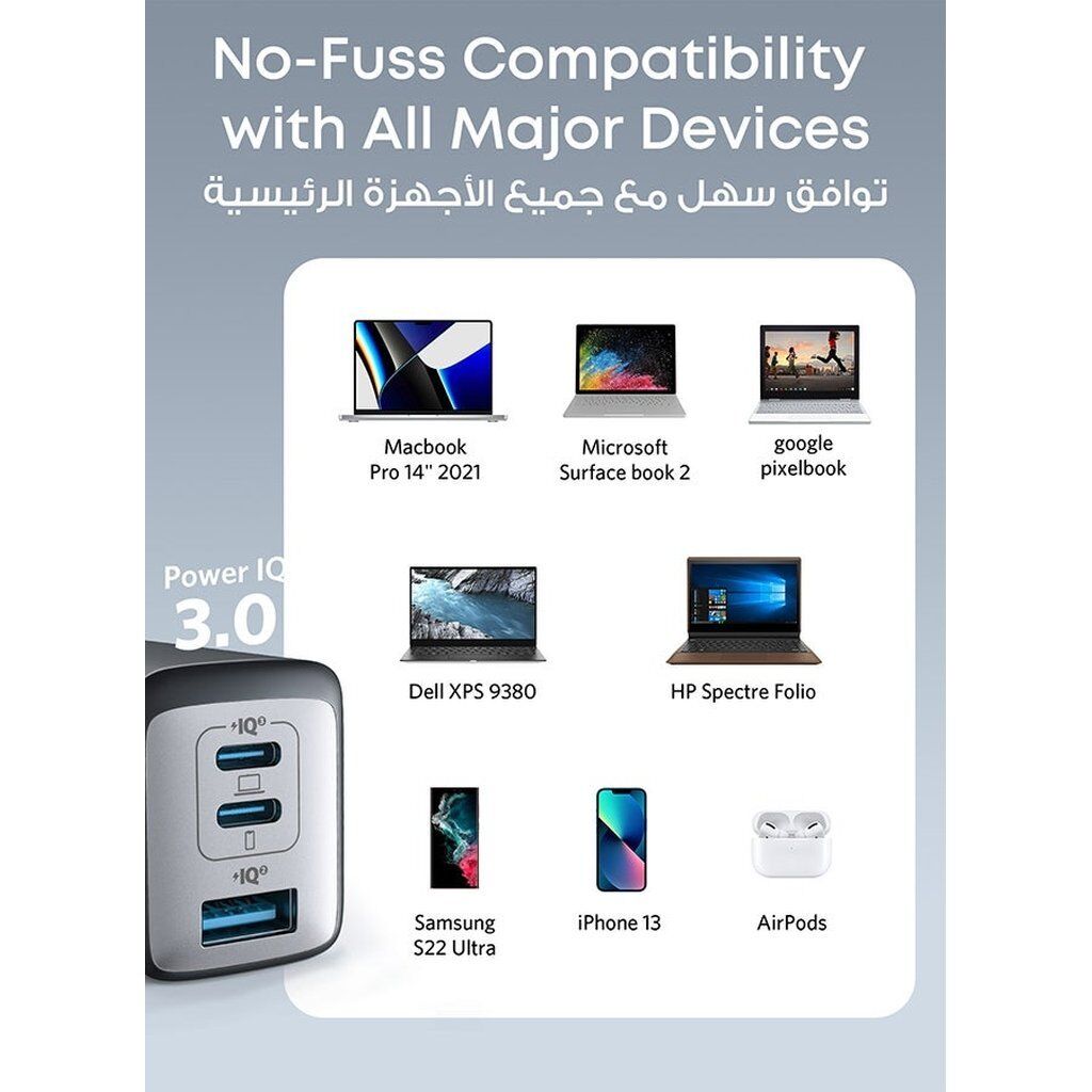 • 3-Port Compact Design – Charge up to 3 devices at once with a charger that’s roughly the size of an AirPods Pro case.